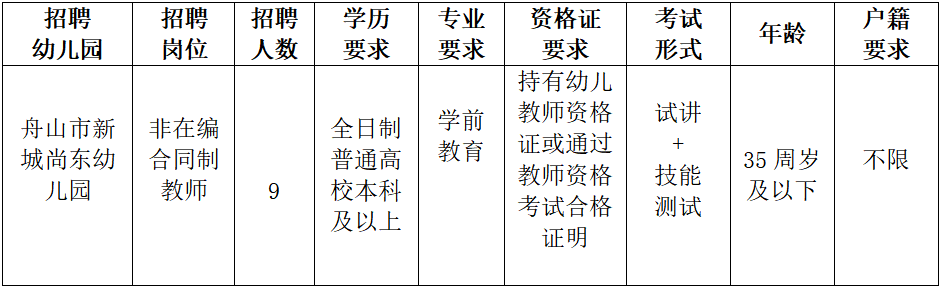 根據(jù)舟教人〔2022〕11號文件《舟山市本級改革創(chuàng)新公辦幼兒園辦園體制實(shí)施方案》要求,經(jīng)舟山市教育局同意,結(jié)合幼兒園實(shí)際需要,舟山市新城尚東幼兒園決定面向社會公開招聘非在編合同制教師9名,現(xiàn)將有關(guān)事項(xiàng)公告如下: